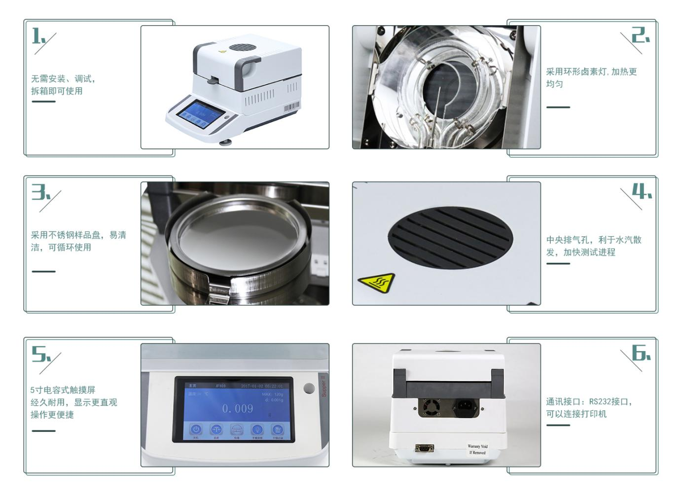 儀器采用加熱失重的原理進行測試,操作簡單,大部分產品可以在短短幾分鐘就得出準確的測試結果:水分含量,固形物含量,回潮率,干燥率,烘干后重量,測試溫度,干燥曲線等。